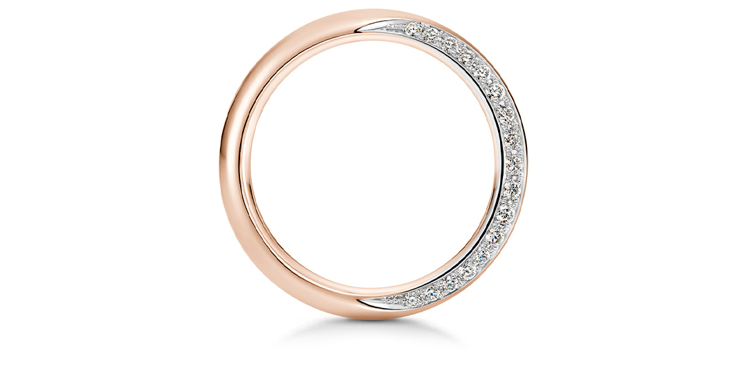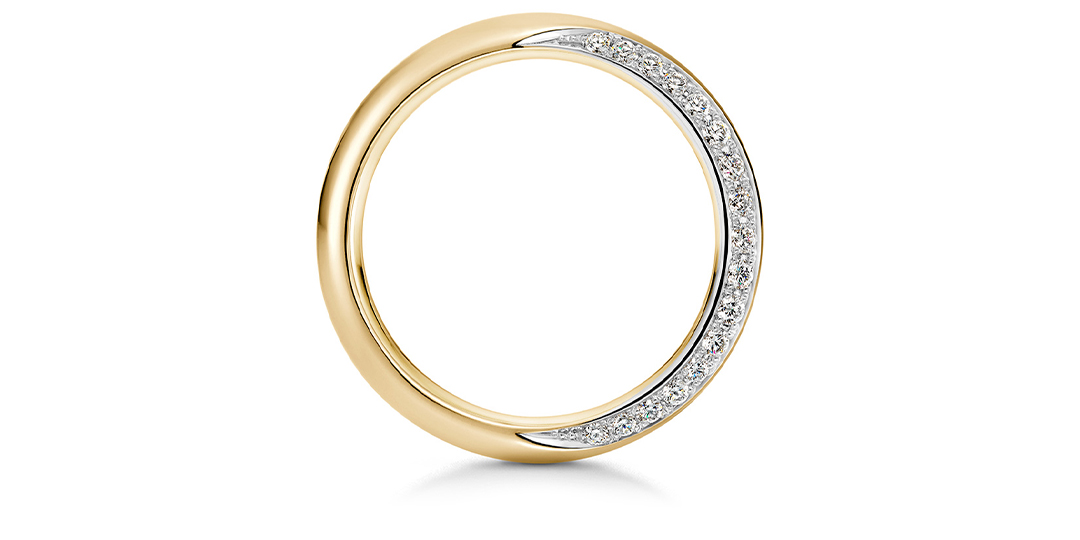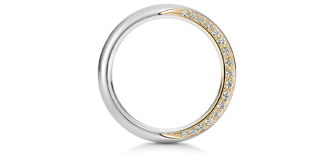 夜空に輝く月のように優しい光で照らし合い、穏やかな人生を歩んでいけますように…。 王道のストレートラインは永く身に着けられる飽きのこないデザイン。片方には指輪の側面にダイヤモンドを、もう一方はつや消し加工を施して三日月を表現して…。シンプルさの中にも、見る角度によってさまざまな表情をお楽しみいただけるスタイリッシュなデザインです。